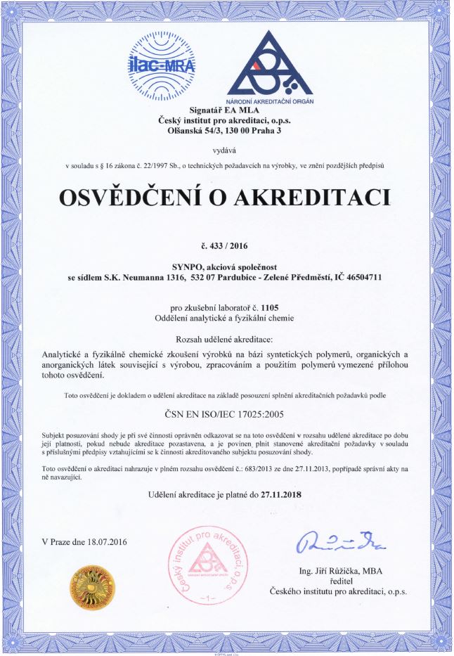 Zkušební laboratoř č. 1105 Oddělení analytické a fyzikální chemie, akreditovaná ČIA podle normy ČSN EN ISO/IEC 17025:2018 pro analytické a fyzikálně chemické zkoušení výrobků na bázi syntetických polymerů, organických a anorganických látek souvisejících s výrobou, zpracováním a použitím polymerů vymezené přílohou akreditačního osvědčení.
